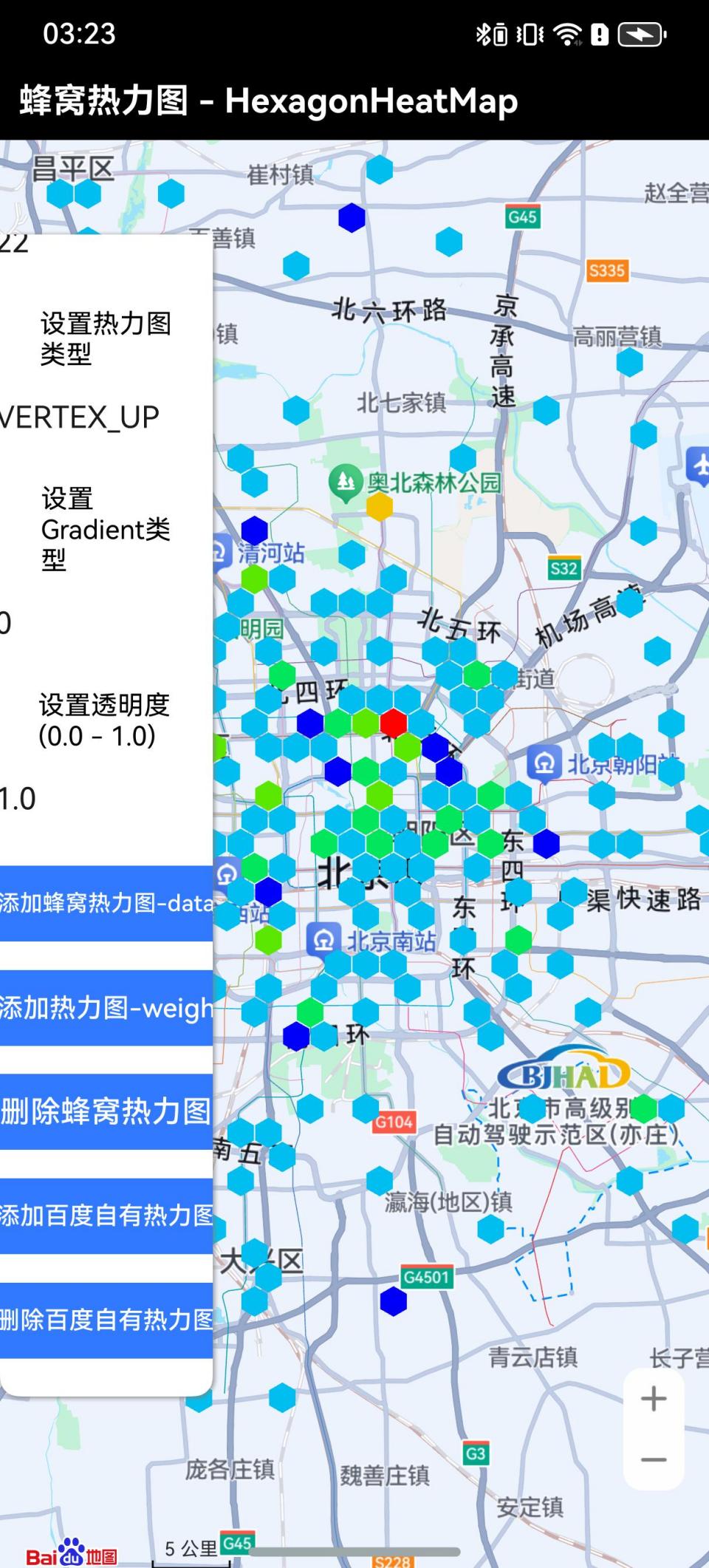 const data = [{"lng":116.895579,"lat":24.306521},{"lng":113.951068,"lat":22.772504},…{"lng":110.00006,"lat":40.603564},{"lng":111.846788,"lat":21.897821}]const datas = data.map(item=>new WeightedLatLng(new LatLng(item.lat,item.lng)),1);this.hexagonMap = new HexagonMapBuilder().setData(datas).radiusValue(radius).gapValue(gap).minIntensityValue(minIntensity).maxIntensityValue(maxIntensity).minShowLevelValue(minShowLevel).maxShowLevelValue(maxShowLevel).setHexagonType(hexagonType).setGradient(gradient).opacityValue(opacity).build();this.mapController.addHexagonMap(this.hexagonMap);
