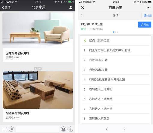 您可以在微信应用中为用户提供位置服务(如周边的家具店),您可通过URI API,调起百度地图产品,为用户展示兴趣店铺的地图位置、店铺的详情、去这里的交通方案等,另外,您还可将URI API编辑成短信,发送给用户,便于随时随地查看。