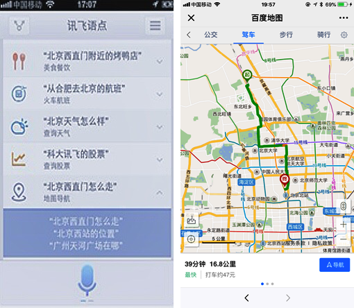 在您制作的语音助手应用中,您可使用URI API,构造一条标准URL,调起百度地图产品,完成一条用户对位置需求的指令,如用户问“北京西直门怎么走”,应用便调起百度地图直观展示交通方案。