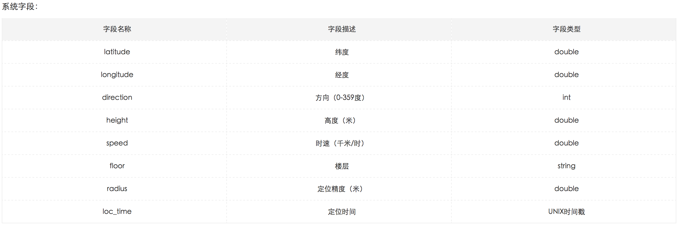 track 属性字段:track 表示轨迹点,代表entity随着时间产生的一串轨迹点(point)。每一个轨迹点,系统已创建了以下字段来描述: