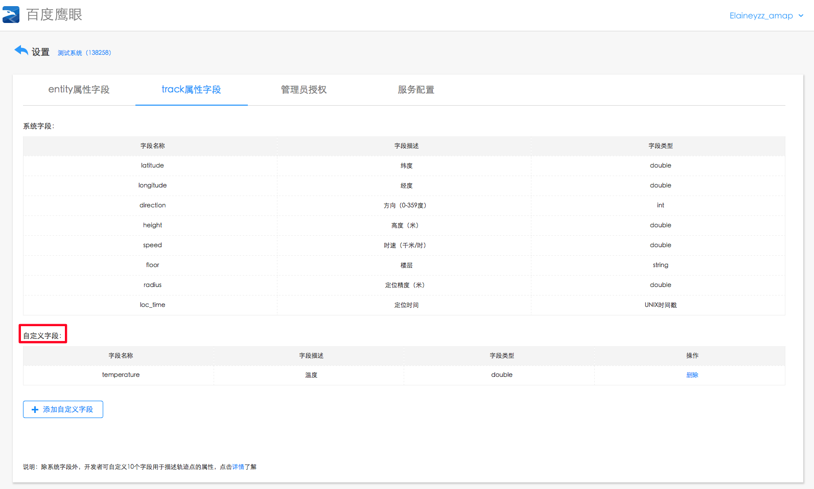 除以上系统字段外,开发者还可以为轨迹点创建自定义字段。例如:温度、电量、油量、光照强度等等。这样,开发者可记录下终端除轨迹之外的其他实时信息。track的自定义字段字符串类型长度限制为2048。