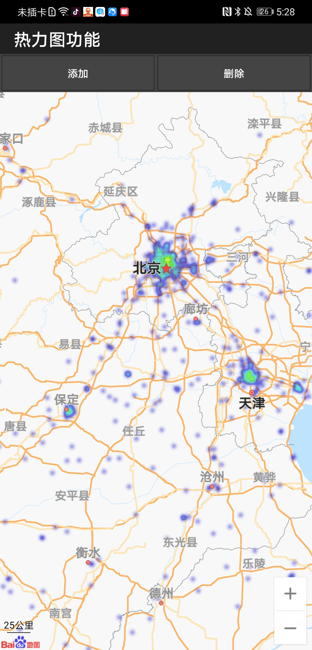 注意:此处的“热力图功能”不同于“百度城市热力图”。百度城市热力图通过简单的接口调用,开发者可展示百度数据的热力图层。而此处的热力图功能,需要开发者传入自己的位置数据(坐标),然后SDK会根据热力图绘制规则,为开发者做本地的热力图渲染绘制。